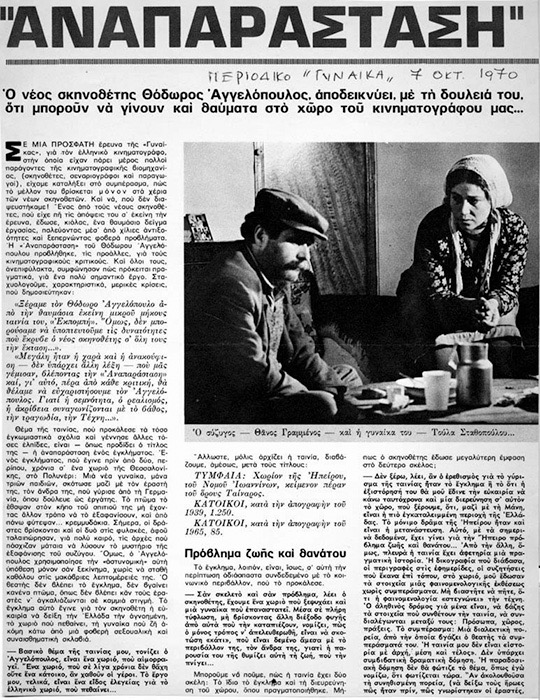 Με την προβολή της Αναπαράστασης του Θόδωρου Αγγελόπουλου (1970), η βιομηχανία του εμπορικού κινηματογράφου έχασε την κοινωνική και πολιτισμική της νομιμοποίηση — και σε λίγα χρόνια και την εμπορική της επιτυχία. Η ταινία του Αγγελόπουλου επανέφερε έναν εναντιωματικό τρόπο θεώρησης των νέων καταστάσεων που είχαν αναδυθεί σε μια κοινωνία που βρισκόταν υπό καθεστώς πολιτικής καταστολής· και το έκανε χωρίς να στραφεί σε έκδηλα πολιτικά μελοδράματα, όπως είχε κάνει ο Κώστας Γαβράς λίγα χρόνια πριν με το πολιτικό θρίλερ Ζ, ή σε οποιαδήποτε άλλη μορφή χολλυγουντιανής ή γαλλικής αφηγηματικής δομής. Η ταινία λειτουργούσε μέσα από τις σιωπές της, τα υπόγεια θέματά της και τις αόρατες δομές που κυριαρχούσαν σ’ ένα ελληνικό τοπίο το οποίο μέχρι τότε προβαλλόταν επί της οθόνης σαν ένας τόπος έμπλεος φωτός και χρώματος, ένας χώρος ευφορίας, πλησμονής και αυτοπραγμάτωσης. Ήταν ως εάν η κινηματογραφική γλώσσα να εγκατέλειπε τη συναισθηματική ενσυναίσθηση του κλασικού κινηματογράφου και να επέστρεφε στα δωρικά και σχεδόν αφηρημένα ιδεογράμματα των βωβών ταινιών. Στην πραγματικότητα, η μορφοπλαστική απεικόνιση επέστρεψε στη λιτότητα, την απλότητα και τη στοιχειακότητα της αρχαϊκής τέχνης. Δεν υπήρχε ούτε εμφανές μοντάζ ούτε απότομες μεταβάσεις ούτε τράβελινγκ: η κάμερα στεκόταν ακίνητη, καταγράφοντας τι είναι το καθετί, πώς είναι και πώς το βλέπουμε. Η απροσδόκητη αίσθηση μιας προφανούς και αυτόδηλης αλήθειας που παρουσιάζεται ενώπιόν μας, όπως τη βιώνουμε καθημερινά, ήταν η έσχατη ηθική αποκάλυψη της οπτικής γλώσσας του Αγγελόπουλου, σε αυτή την πρώτη αντιψευδαισθησιακή ταινία που γυρίστηκε ποτέ στην Ελλάδα.